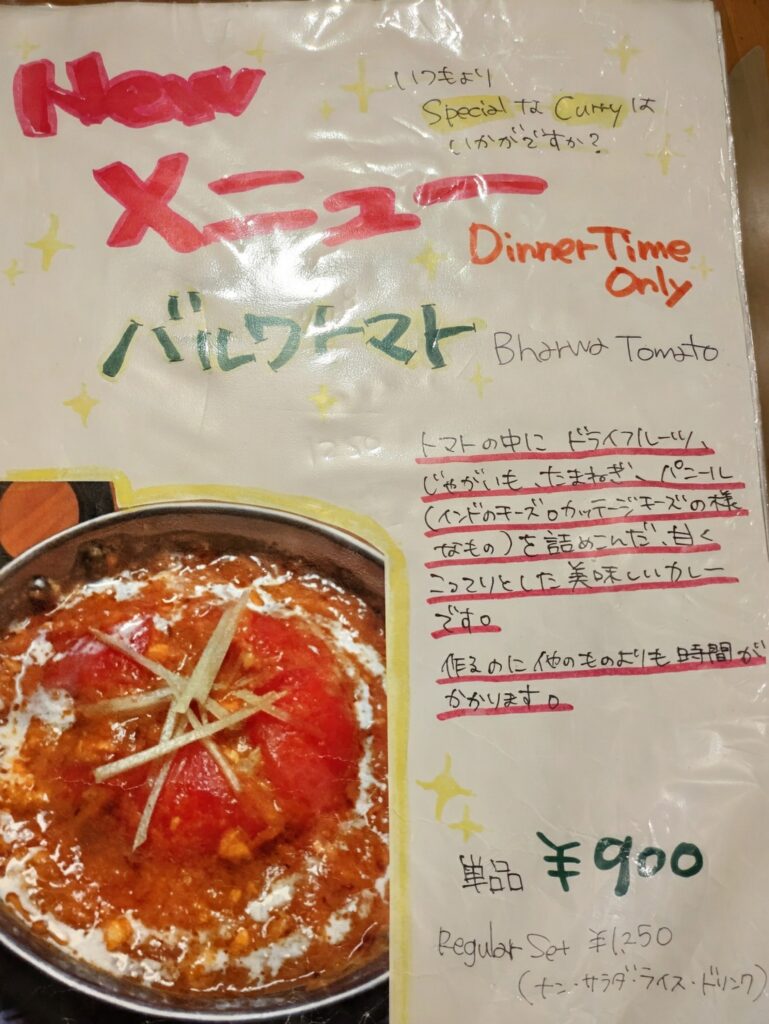 着席、メニューを開くなり、目についたのは、「New メニュー」の文字。「バルワ・トマト」??